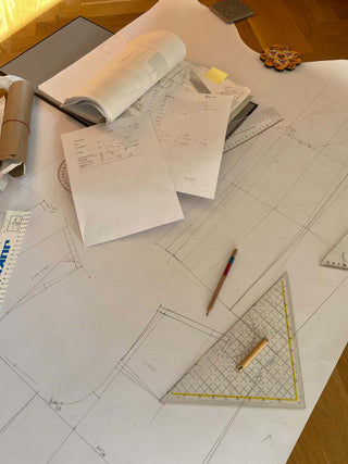 Der Designprozess findet in unserem Atelier in Wien statt. Von der Schnittkonstruktion über die Prototypenanfertigung und Anpassungen, bis hin zur sorgfältigen Auswahl der Stoffe und Knöpfe – jeder Schritt wird von der Designerin persönlich durchgeführt. Dabei stehen die Bedürfnisse der Kunden stets im Mittelpunkt, um sicherzustellen, dass jedes Stück nicht nur einzigartig ist, sondern auch zu einem neuen Lieblingsstück wird.